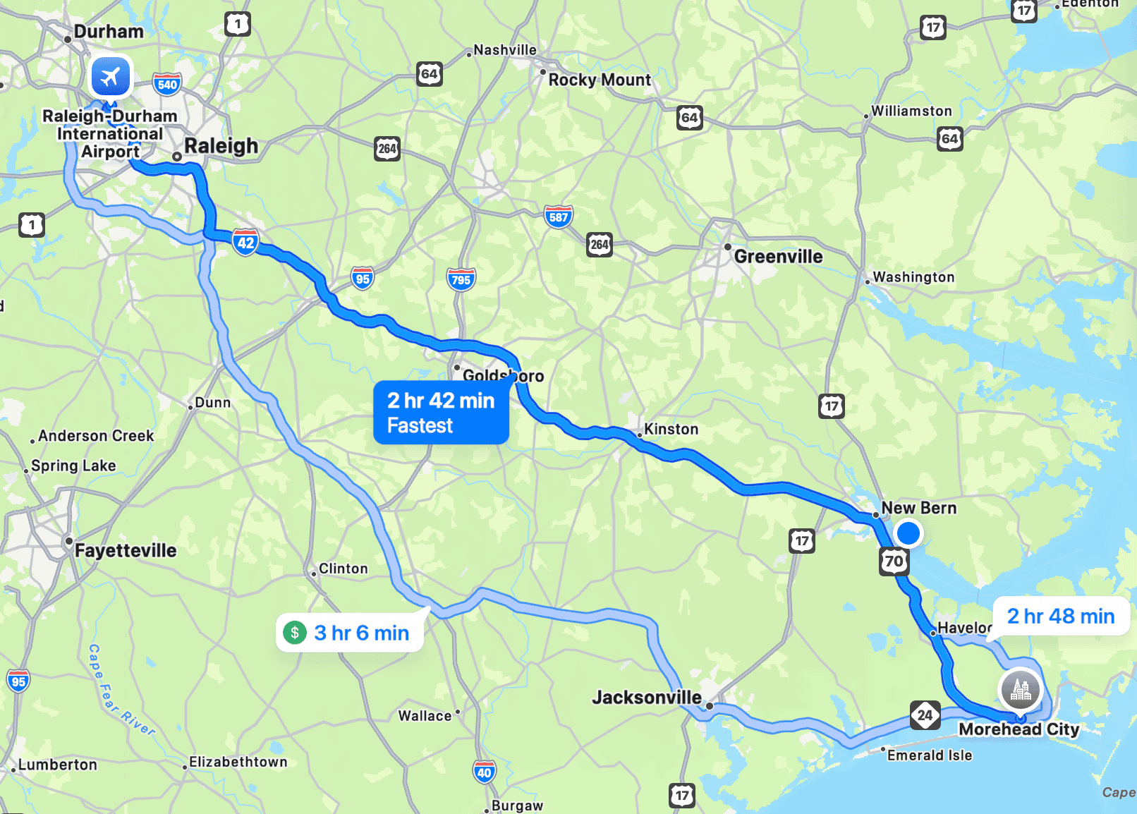 In these maps, I’ve used Morehead City (a central location on the Crystal Coast) as the arrival point for these maps.
